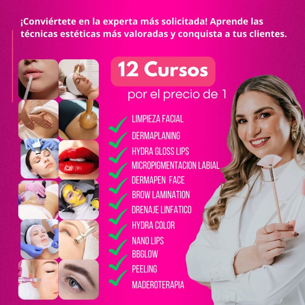 12 CURSOS EN 1 – Incluye 12 TÉCNICAS, las técnicas más solicitadas en estética facial y corporal: BB Glow, Nano Lips, Maderoterapia, Dermaplaning, Limpieza facial, Brow Lamination, Drenaje linfatico, Hydra color lips, Micropigmentacion, Dermapen y más…
