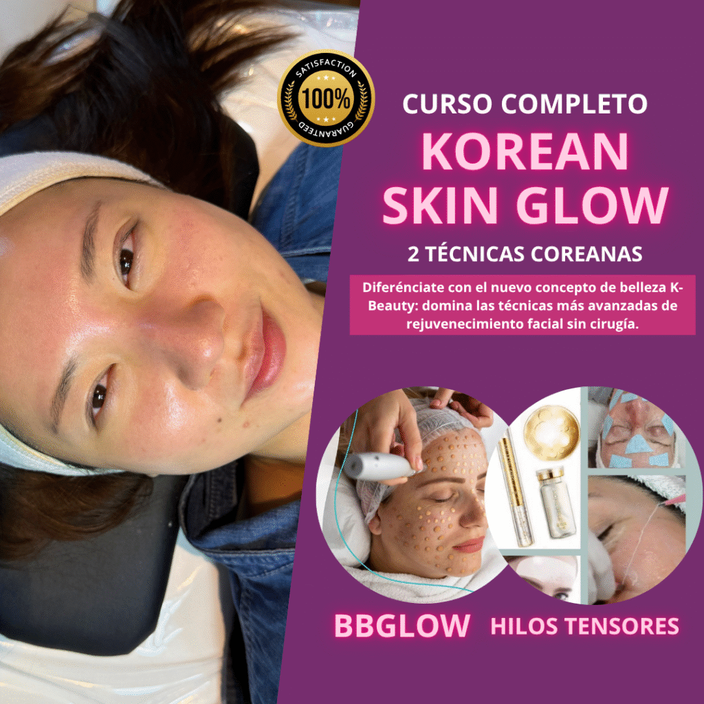 KOREAN SKIN GLOW: Curso que enseña un método innovador de rejuvenecimiento facial combinando dos técnicas coreanas: BB Glow y Hilos Tensores Cosmetológicos. Ideal para quienes buscan resultados luminosos, tensores y un acabado de piel efecto porcelana.